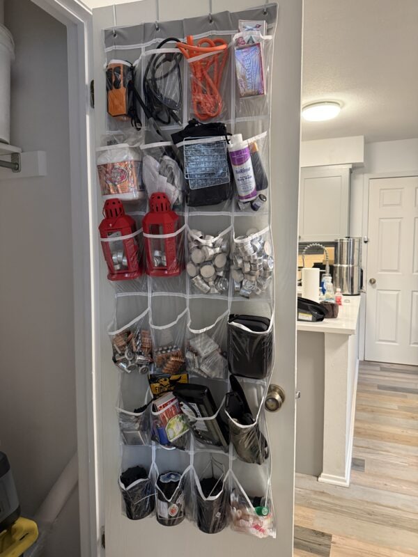 A simple over-the-door shoe organizer turned into a fully functional prepper station.