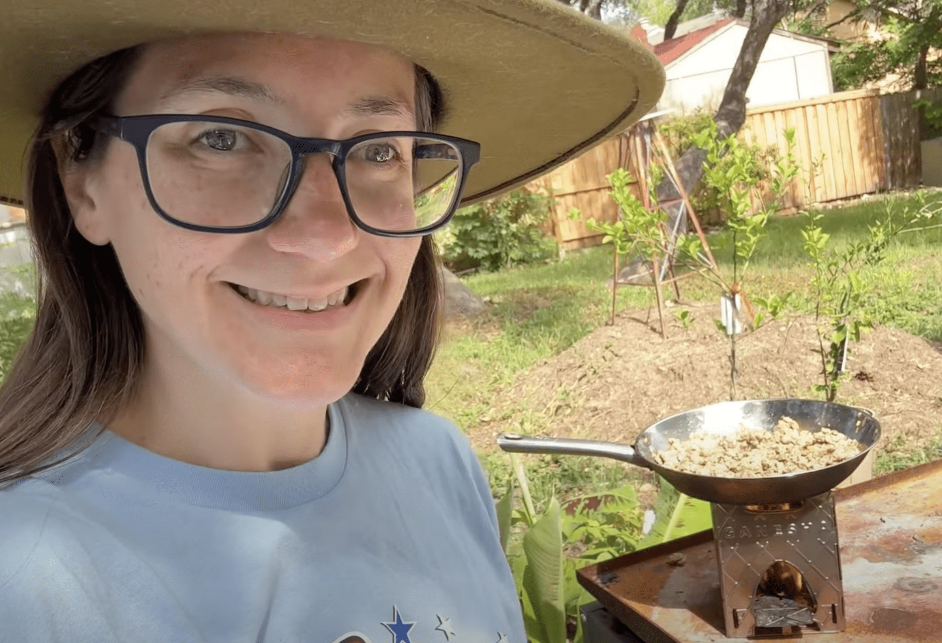 Breakfast: I cooked eggs with bacon bits on a Blackstone cast iron skillet resting on the Ganesha stove. It took about 20 to 30 minutes total, including fire preparation and cooking time. The stove heats up quickly, and although the cast iron surface was hot from the sun, it worked well for frying the eggs. Cleaning the stove afterward is straightforward even if not done immediately.